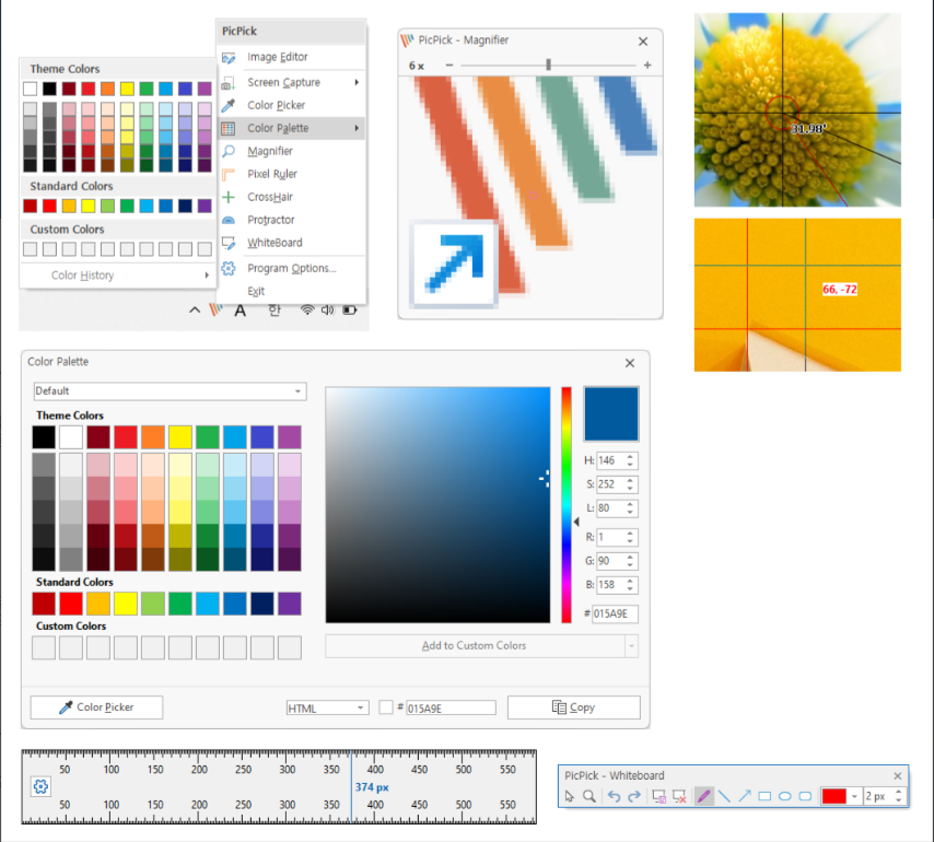 색상 추출 도구, 색상 팔레트, 눈금자, 각도기, 십자선, 돋보기, 화면 그리기 도구 등