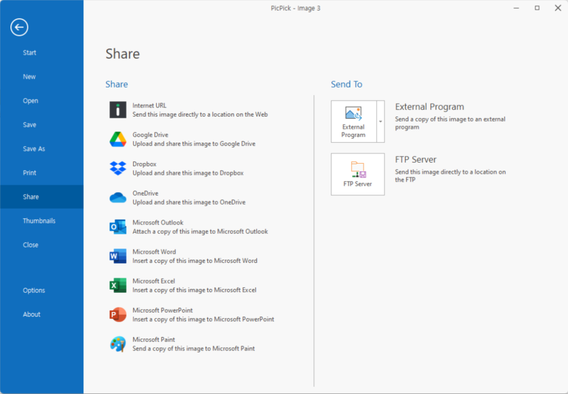 다양한 형식의 이미지 파일로 저장, 프린터 출력, URL로 저장, 이메일, 페이스북, 트위터, 드롭박스, 구글 드라이브, FTP 공유 등