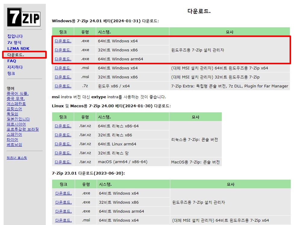 7-Zip은 우리나라에서는 사용하는 사람이 거의 없지만 한국어 지원이 되며, 1999년 출시 이후 전 세계적으로 많이 사용하고 있으며, 러시아의 소프트웨어 개발업체인 이고르 파블로프가 개발한 무료 압축 프로그램입니다. 아래를 통해 이용해 보십시오.